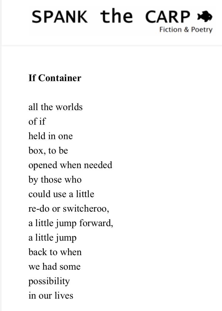 The new issue of literary magazine Spank the Carp was released today (April 1). I’m pleased to be represented by one poem “If Container.” You can read the complete poem here.