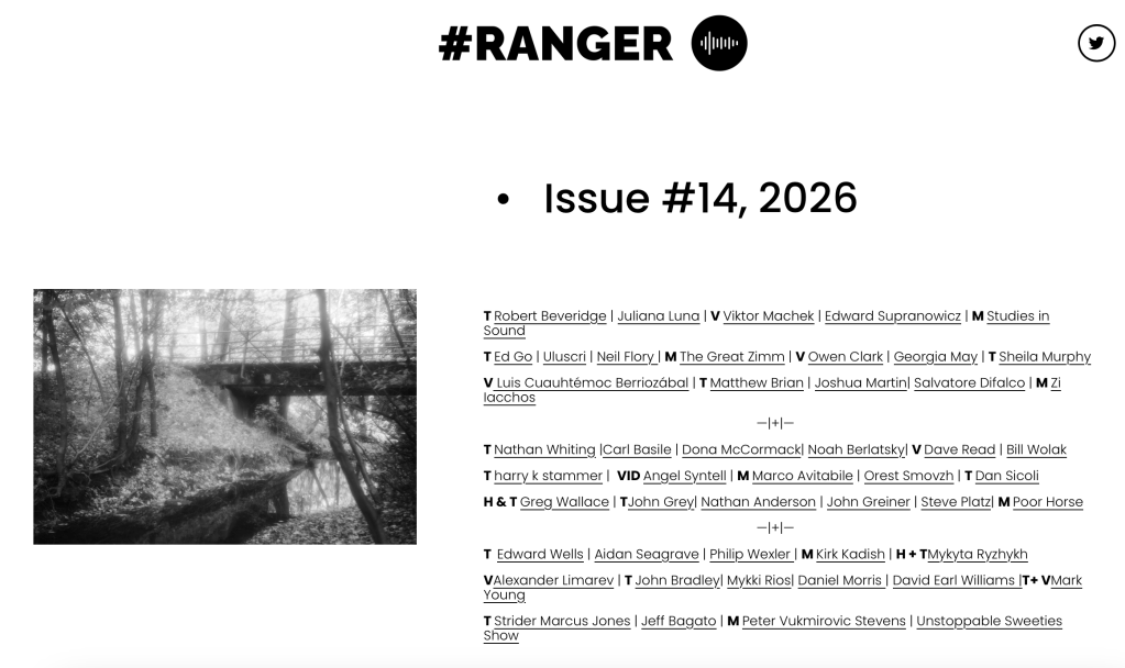 Literary magazine Ranger has just released its 14th issue, packed with experimental works in text, video, video and music formats. Contents in image below.