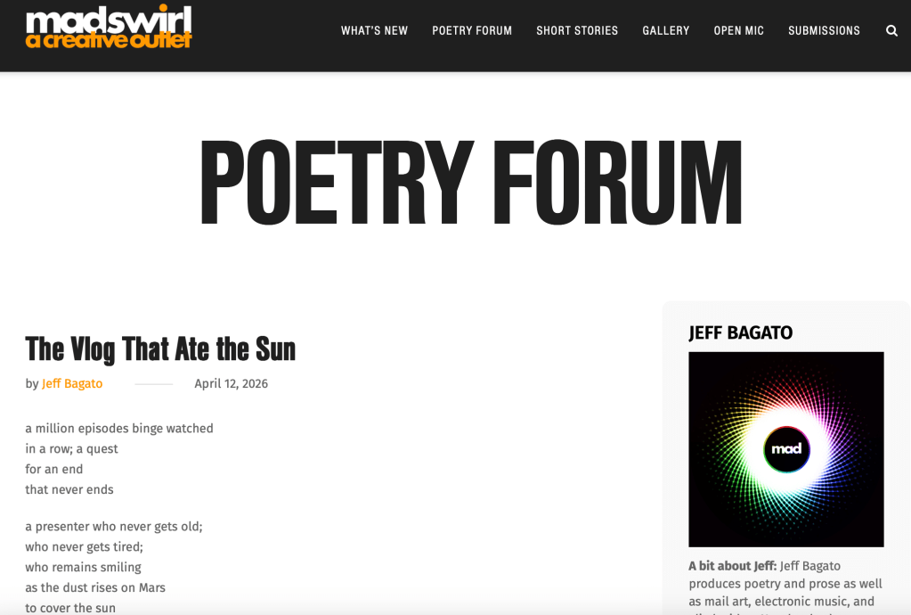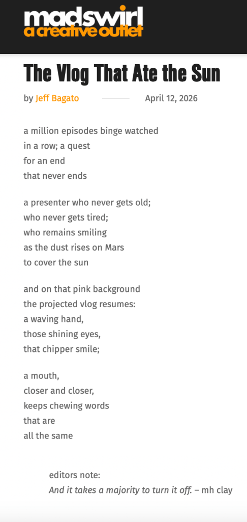 “The Vlog that Ate the Sun” published in Mad Swirl Today, my poem “The Vlog that Ate the Sun” was published in Mad Swirl literary review. You can read the full poem here. Share this: Share on X (Opens in new window) X Share on Facebook (Opens in new window) Facebook Like Loading...
