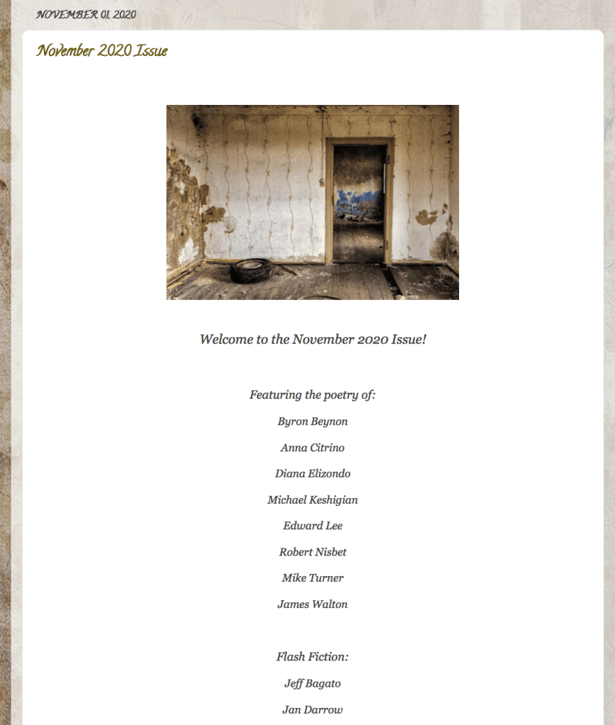I’m pleased to be included in this issue with five very short stories. Perhaps you could call them “flash fictions”: “Air,” “Good Sign,” “Guessing Games,” “Lingering,” and “Normal.” The images are integral to each work, although the texts may or may not be related.