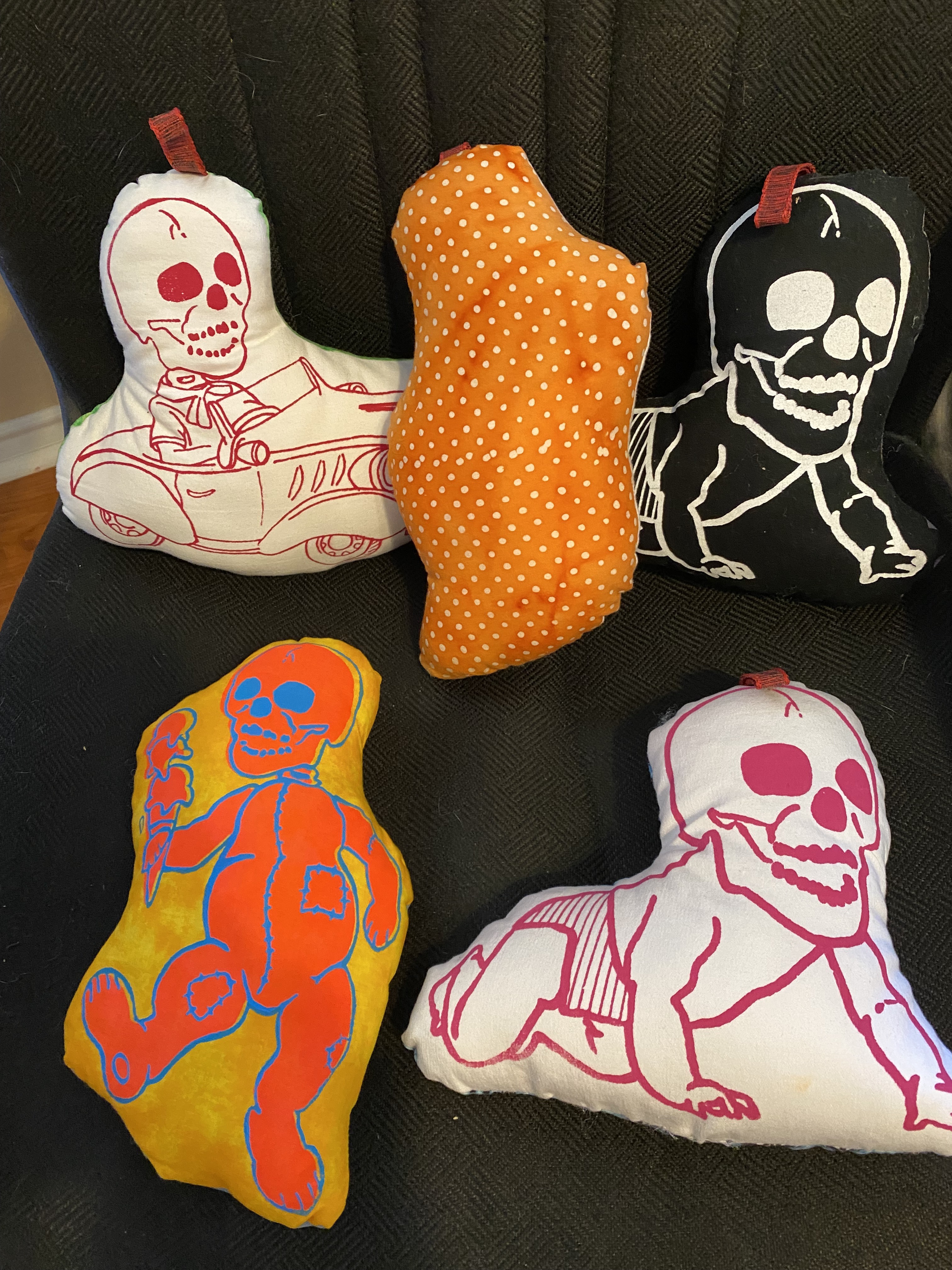 Screen printed Skull Baby pillows now at Mockingbird Handprints gallery