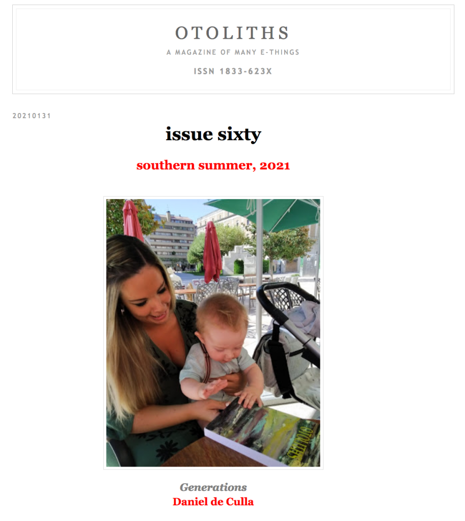 The Southern Winter edition of Australian based online lit mag Otoliths, Issue #62, was released today. Every issue of Otoliths functions as an index or encyclopedia of the current streams and practitioners of the literary avant garde, and this one is no exception. As editor Mark Young writes: “It’s another lively issue with a mix of short story, review, photography, poetry, painting, & collage in a variety of styles, by an outstanding list of contributors, often in collaboration, from around the globe.”